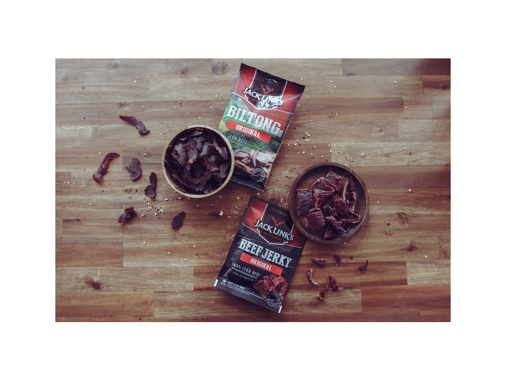 Obidva zdravé snacky sú vyrobené zo 100% chudého hovädzieho mäsa, ale Beef Jerky a Beef Biltong vám ponúkajú odlišnú chuť a zážitok z textúry. Jerky je vždy jemne údené a má sladšiu chuť, zatiaľ čo Biltong nie je nikdy údený a je marinovaný aj s liehovým octom. Biltong má tiež pomalšiu dobu schnutia a plátky mäsa sú hrubšie.